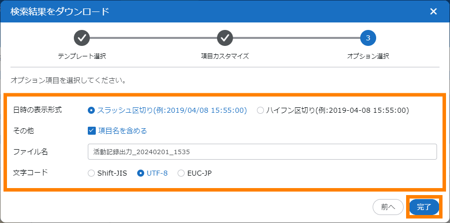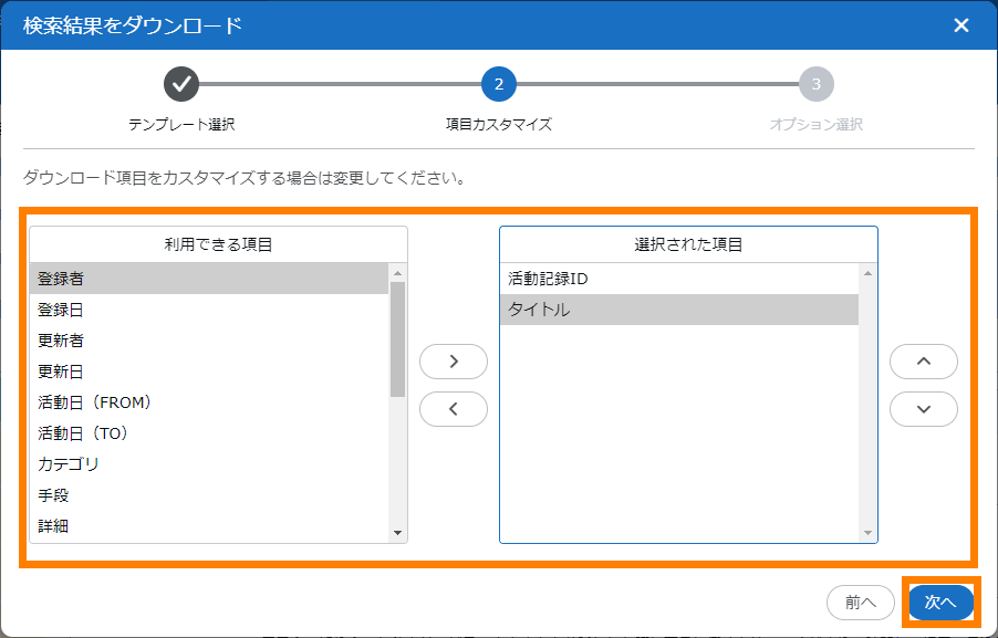 | キーワード入力項目(※1) | 活動記録の特定の項目を検索の条件に追加できます。対象となる項目は、「タイトル」「詳細」です。項目は、キーワードを入力し、「すべて含む」または「いずれかを含む」を選択してください。また、半角スペースで区切ることで複数のキーワードを入力することもできます。 | ||