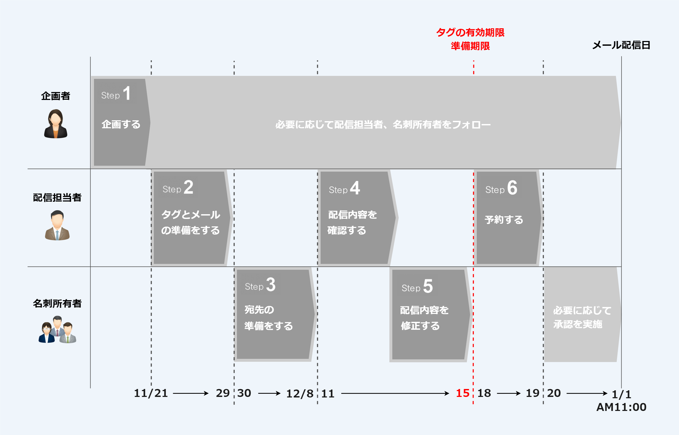 「タグの有効期限を設定する」にチェックを入れタグの有効期限を設定することで、期限日以降の名刺へのタグの付与を禁止します。タグの有効期限をStep5の最終日(12月15日)に設定することで、Step6以降に配信内容の確認を行っていないメールが増えてしまうことを防げます。