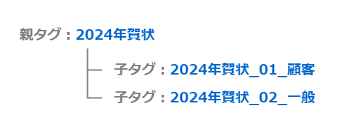 メールの文面を変えたい宛先グループの数だけ共有タグを作成します。今回は、企画者から「顧客」「一般」向けの2パターンのメールを作成するように依頼があったため、親タグ「2024年賀状」を登録し、子タグ「2024年賀状_01_顧客」「2024年賀状_02_一般」を登録します。