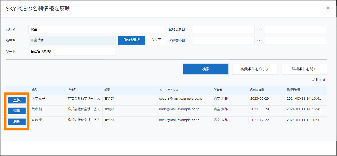 - 「所有者」を検索条件に追加する場合は、[所有者選択]をクリックすると表示される画面で検索条件に追加する名刺所有者を選択してください。