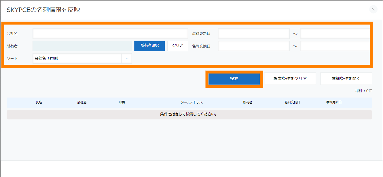 ④ レコード情報に反映する名刺情報の検索条件を入力し、[検索]をクリックする。