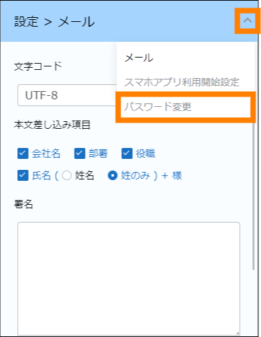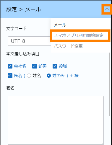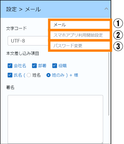 | ① | 文字コード | タップすると表示されるリストから、メール送信時の文字コードが選択できます。選択できる文字コードは、「UTF-8」「Shift-JIS」「ISO-2022-JP」です。 |