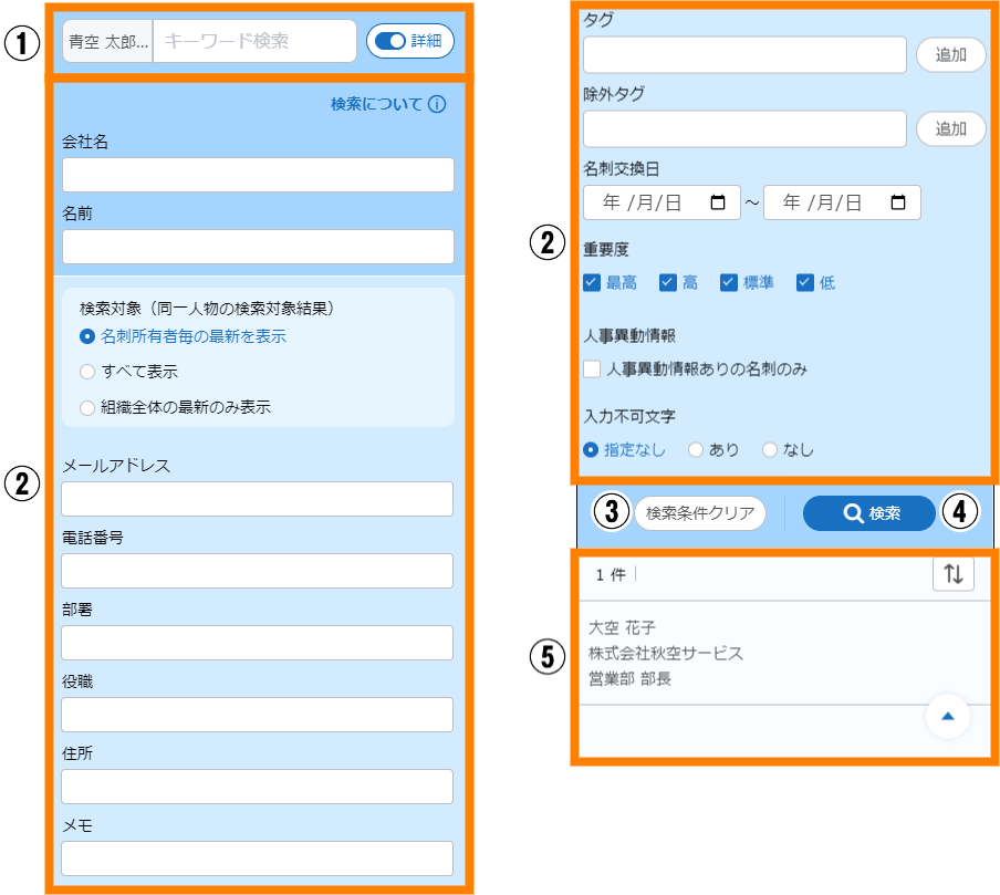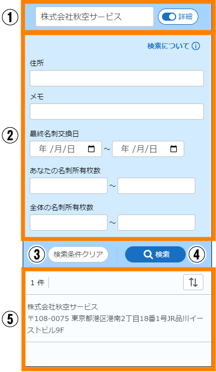 | ⑤ | 名刺情報一覧 | 検索結果の名刺情報が一覧で表示されます。 | |