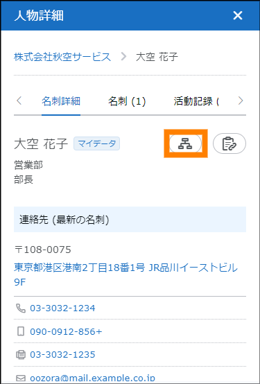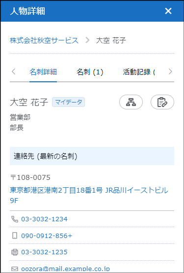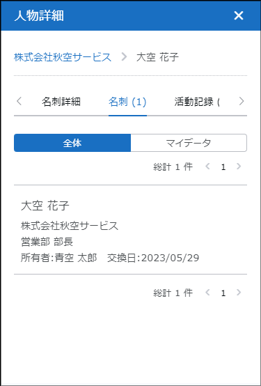 - 「人物詳細」画面の「名刺」では、人物と紐づいた名刺が確認できます。名刺は、同一人物の名寄せを行うと更新されます。