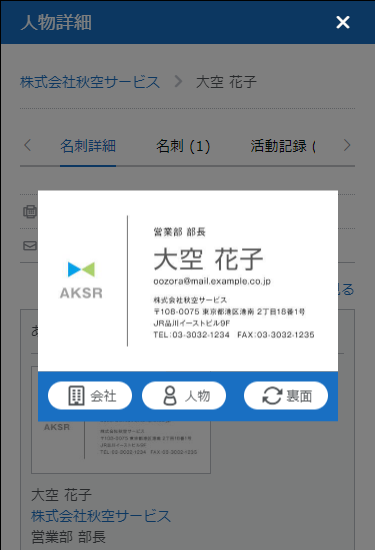 「名刺情報一覧」で名刺情報をタップすると、「人物詳細」画面が表示され、人物と紐づいた名刺の詳細情報が確認できます。