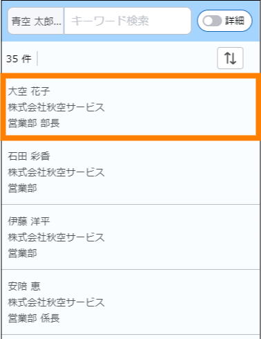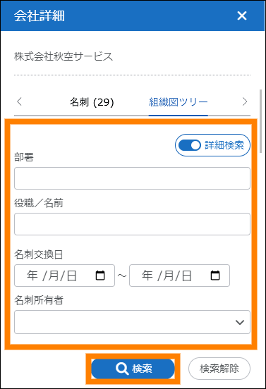 名刺情報を検索・閲覧します。名刺情報は、検索対象となる範囲(名刺所有者)を選択し、会社名、個人名などのキーワードを入力して検索できます。また、詳細検索を使うことでさらに検索結果を絞り込むことができます。