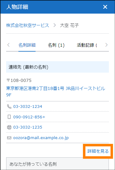 - 「連絡先(最新の名刺)」の「詳細を見る」をタップすると、追加情報の閲覧ができます。