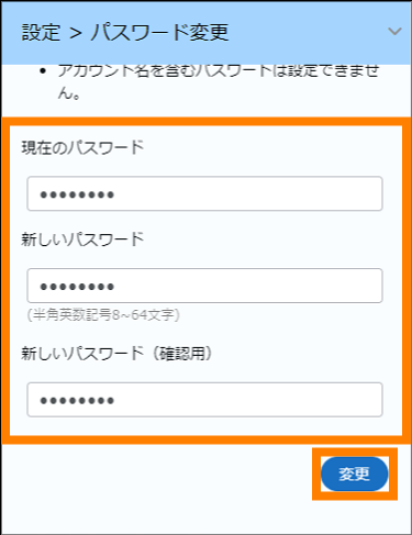 ④ 「現在のパスワード」を入力し、「新しいパスワード」と「新しいパスワード(確認用)」に任意のパスワードを入力し、[変更]をタップする。