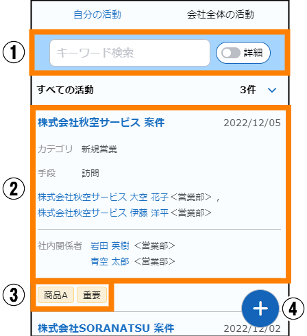 | ① | 検索範囲 | タップすると、「所有者選択」画面が表示され、検索の対象となる範囲が選択できます。また、「キーワード検索(※1)」に入力したキーワードと一致する会社名、名前で検索できます。 | |