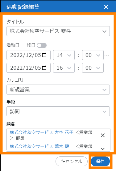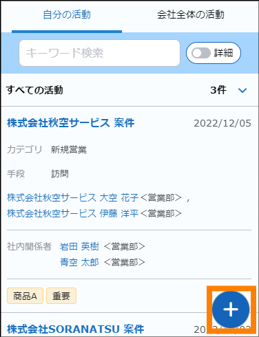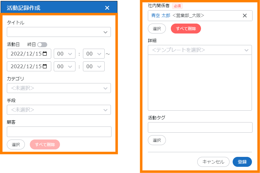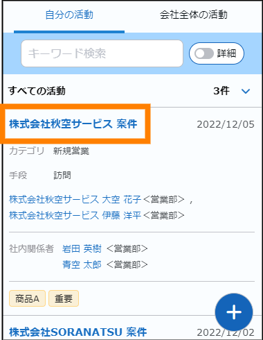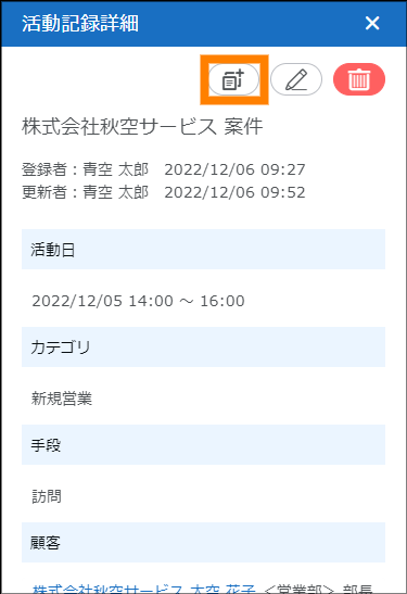 - コピーする活動記録の「社内関係者」に自分(ログインしたユーザー)が含まれていない、かつ「顧客」に非公開名刺が含まれている場合は、コピーして新しい活動記録を登録できません。