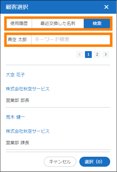 「顧客選択」画面では、「使用履歴」「最近交換した名刺」「検索」のいずれかを選択し、顧客を選択してください。