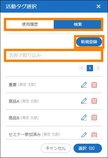 - 「検索」では、キーワードを入力して活動タグの検索ができます。[新規登録]をタップして、活動タグを登録することもできます。活動タグの登録については、「4.1.4.4. 活動タグを登録、編集、削除する」を参照してください。