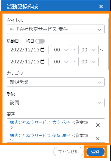 | 活動日 | 活動日を入力します。日時(期間)で指定してください。「終日 |