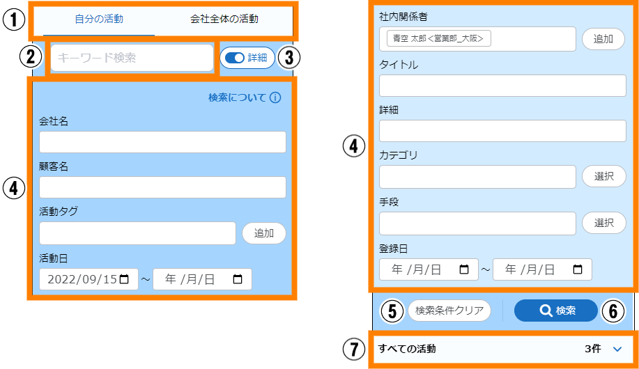 キーワード入力項目(会社名、名前、顧客名を対象とする項目を除く)で同一の項目に対し複数の条件を入力した場合は、入力した内容のいずれかに一致する条件で検索(OR検索)されます。