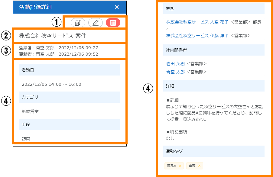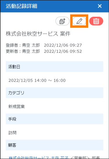 - 「活動記録詳細」画面については、「4.1.4.1. 活動記録を検索・閲覧する」を参照してください。