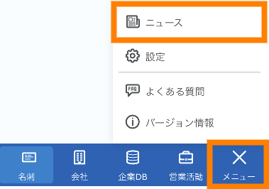 | ⑤ | メニュー | 自分(ログインしたユーザー)が所有している名刺の会社情報に関連するニュースの確認ができます。 | 参照 |