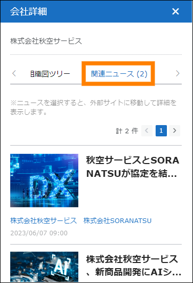 - 「人物詳細」画面の「関連ニュース」では、人物が現在所属している組織に関連するニュースが確認できます。詳しくは、「4.1.5. ニュースを表示する」を参照してください。