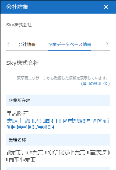 「SKYPCE(名刺管理)」の各項目について説明します。「SKYPCE(名刺管理)」では、名刺情報や会社情報の閲覧ができます。各項目の詳細については、参照先を確認してください。