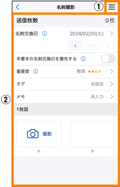 | ① | 手書きの名刺交換日を優先する | タップすると、初期状態「優先する( |