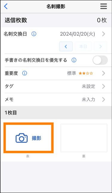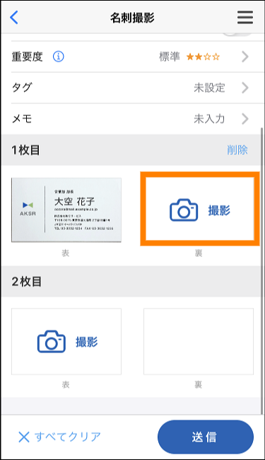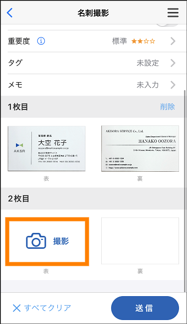 ⑤ 別の名刺を撮影する場合は、 2枚目の「表」の「撮影」をタップする。