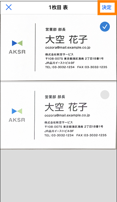 - 複数枚撮影した場合は、[保存]をタップすると、送信候補の名刺の画像が一覧で表示されます。送信する名刺の画像を選択し、「決定」をタップしてください。