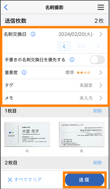 - 1回の送信で複数枚の名刺の画像を送信する場合、すべての名刺の次の項目が同じ設定になります。次の項目を名刺によって異なる設定にしたい場合、名刺は分けておき、送信完了後に再度撮影を実行してください。