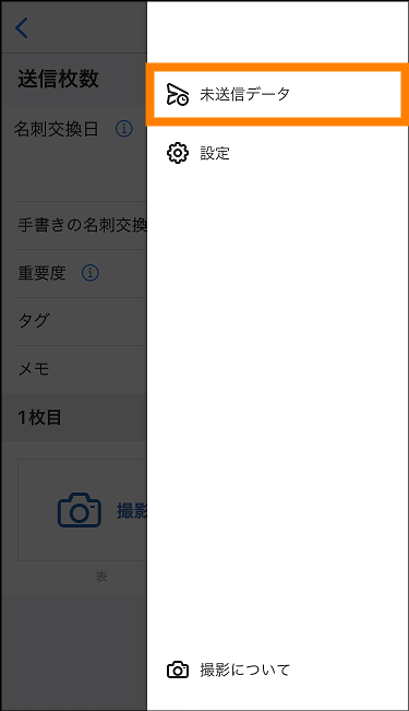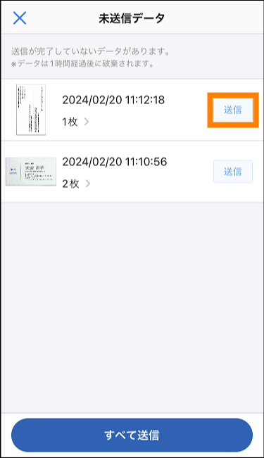- 名刺を連続で撮影し、いずれかの名刺の画像が送信できなかった場合もまとめて未送信データとして扱われ、再送信が実行されます。ただし、すでに送信に成功している名刺の画像は、再送信の対象となりません。