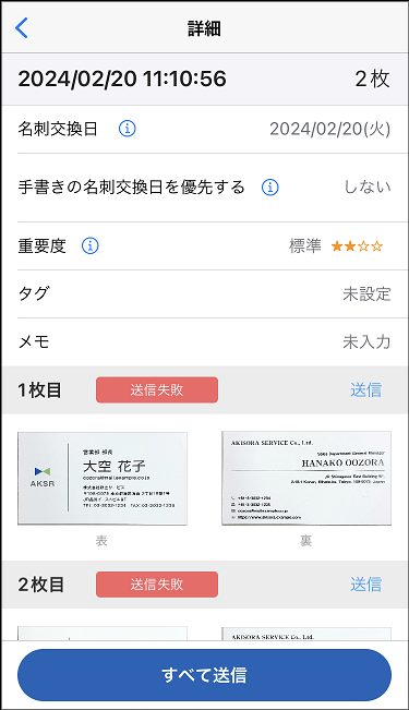 任意の未送信データをタップすると、送信時の設定や撮影した名刺の画像が閲覧できる「詳細」画面が表示されます。