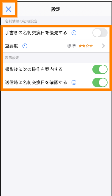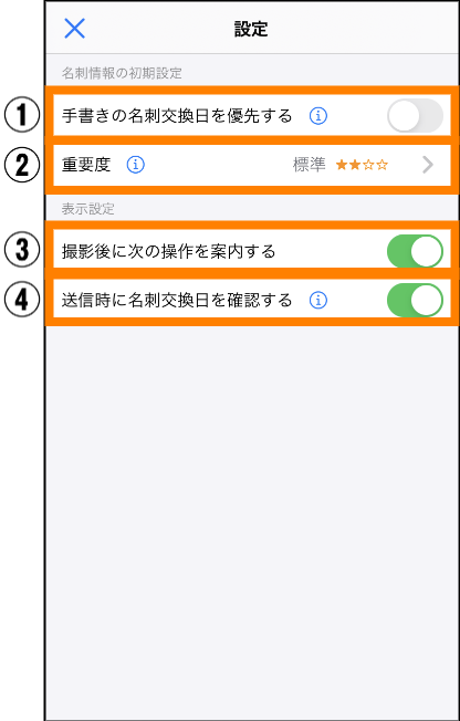 | ② | 重要度 | タップすると表示される画面で名刺の重要度の初期状態が設定できます。選択できる項目は、「最高」「高」「標準」「低」です。 |