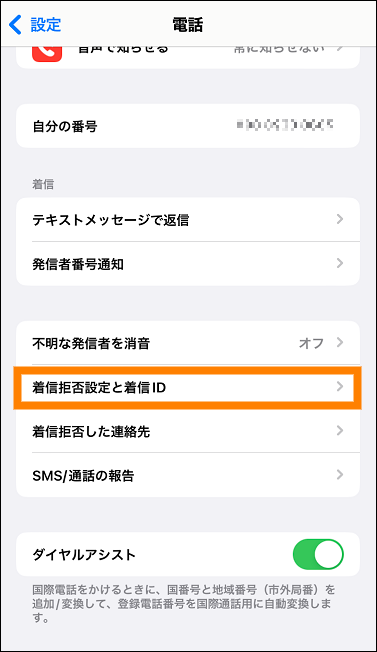 ④ 「着信拒否設定と着信ID」をタップする。