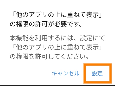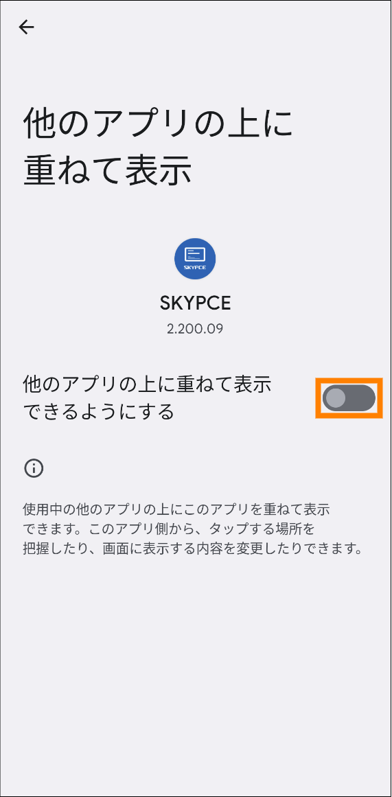 - (Android OSの場合)ほかのアプリの上に重ねて表示する機能を「SKYPCE(スマートフォンアプリ)」に許可