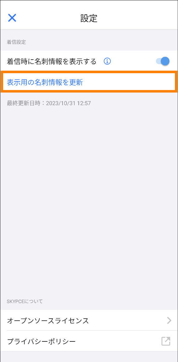 - 設定完了後、「表示用の名刺情報を更新」が表示されます。着信時に最新の名刺情報を表示するためには、適宜「表示用の名刺情報を更新」をタップしてください。「表示用の名刺情報を更新」をタップすることで、「SKYPCE(名刺管理)」に登録されている最新の名刺情報を取得できます。